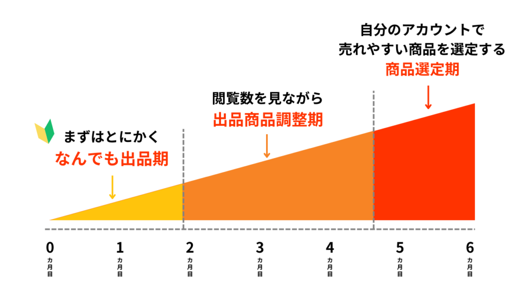 物販ビジネスを始めて0〜2カ月は「なんでも出品期」、言い換えると、商品を選定しすぎずコンスタントに出品しながら「出品数を増やして土台を作ること」を最重要とする時期です。この時期は、1品1品吟味しながら、「この商品は売れるかな?」「見てもらえるかな?」と1つの商品の出品に長時間悩んでしまうのはなるべく避けましょう。初めのうちは商品を選定するためのデータがないので、まずは土台を作りながらデータが取れる状態を目指すことが重要です。