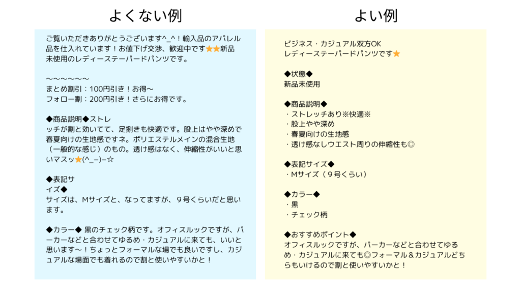 このように商品説明文を工夫することで、購入者にとって魅力的でわかりやすい情報提供ができ、売上アップにつながる可能性が高まります。ぜひこの基本を参考にアレンジしてみてください。