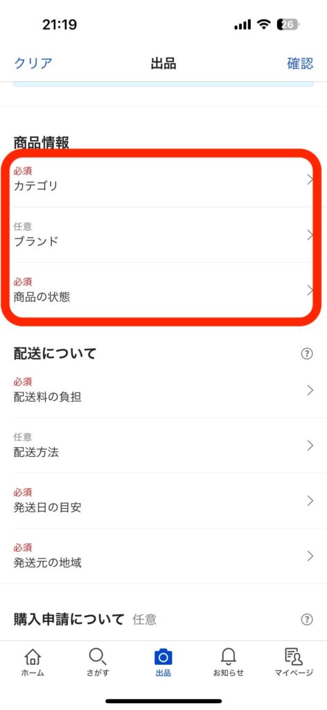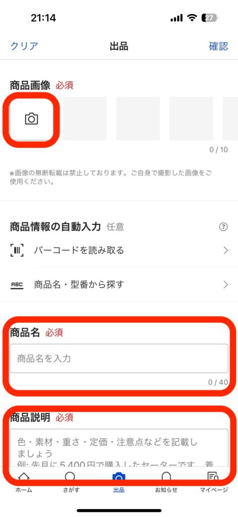 出品メニューを選択すると画像のような画面に切り替わるので、商品画像や商品名、商品説明を入力します。