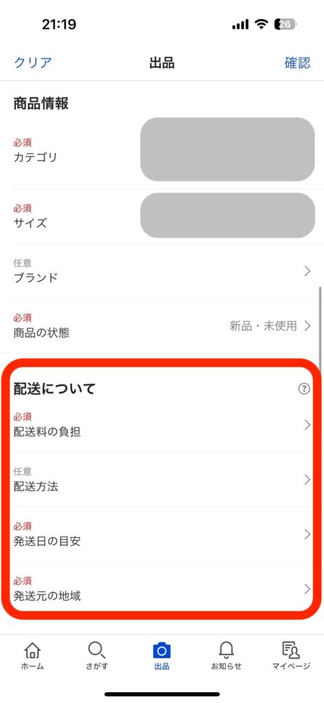 送料込みと着払いが選べますが、当物販ビジネスで取り扱う商品を出品する際は「送料込み」を選択します。