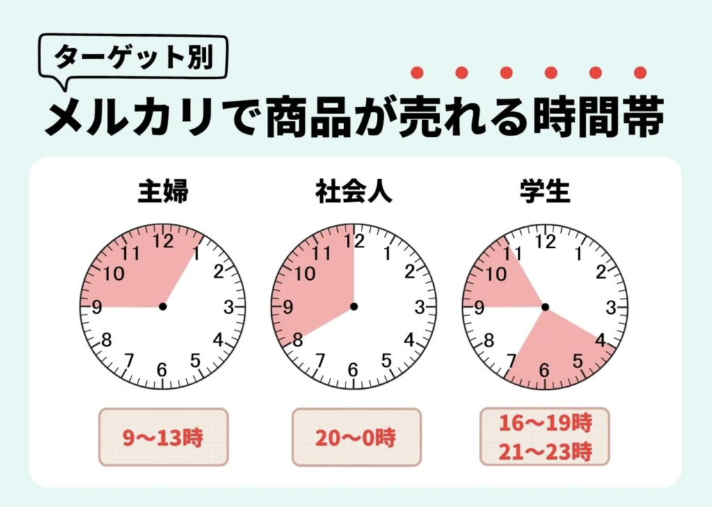 買い物をするためにネットで商品を検索するとき、下の方や最後の方まで全ての商品を閲覧した後に欲しいものを決める、という方はあまりいないですよね?ある程度欲しいものの価格帯を調べてあとは、評価がいい方や画像が見やすい方の商品を購入されると思います。この視点で、閲覧が多い(商品がよく売れる時間)を狙っていけるとより効果が出やすくなります。メルカリで商品が売れやすいタイミングは、基本的には18時~24時の夜間です。その中でもターゲットによって時間を分けることができます。