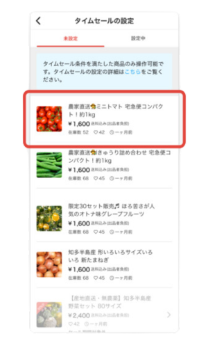 販売中の商品からタイムセールを設定したい商品をタッチ